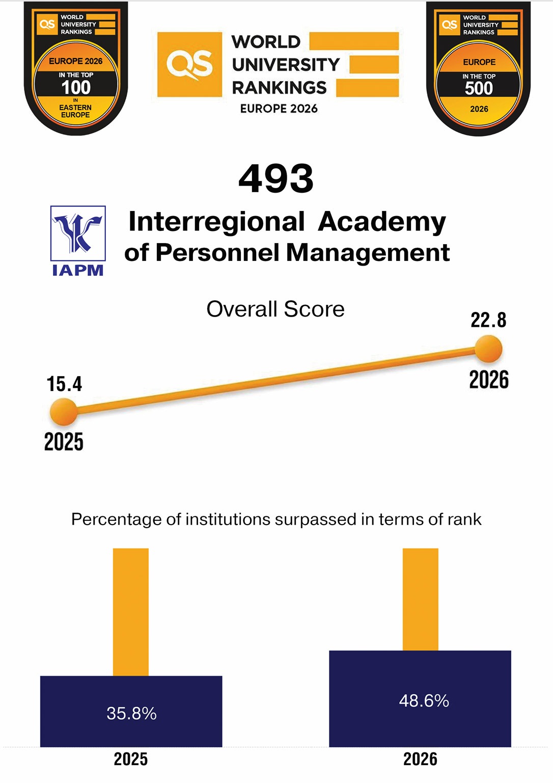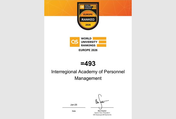 Міжрегіональна Академія управління персоналом продемонструвала вагомий прогрес у престижному міжнародному рейтингу QS World University Rankings: Europe 2026, посівши 493 місце серед університетів Європі. Крім того, Академія відзначена серед ТОП-100 закладів Східної Європи.