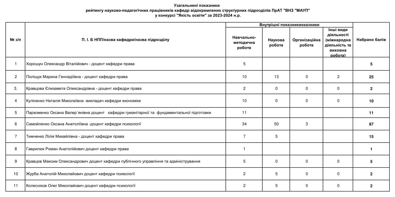 За підсумками 2023-2024 навчального року проведено щорічний конкурс "Якість освіти" серед кафедр відокремлених структурних підрозділів ПрАТ ВНЗ "МАУП". Рейтинг кафедр формувався на основі комплексної оцінки показників діяльності, що включають навчально-методичну роботу, наукову активність, організаційну діяльність та інші важливі критерії якості освітнього процесу.